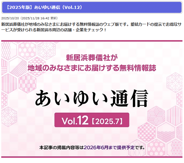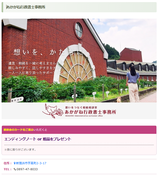 この度、新居浜葬儀社様が発行されている地域情報誌「あいゆい通信」に、あかがね行政書士事務所を掲載していただきました。